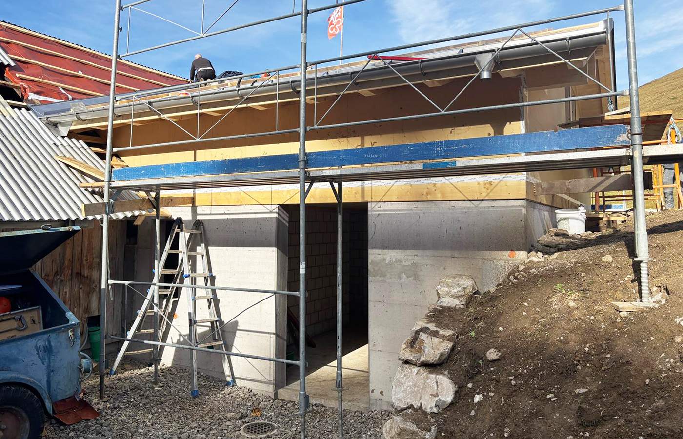 Im Herbst 2025 haben die Bauarbeiten gestartet. Rechtzeitig vor dem Wintereinbruch konnten die Maurerarbeiten abgeschlossen werden. Auch die Holzbauer und Dachdecker konnten ihre Arbeiten fertigstellen und den Anbau somit winterdicht machen.